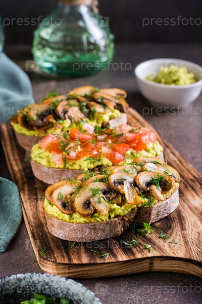 Бутерброды с авокадо, жареными шампиньонами, помидорами и зеленью на ржаном хлебе на доске по вертикали