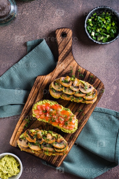 Бутерброды на ржаном хлебе с гуакамоле, жареными грибами, помидорами и укропом сверху и вертикальным видом