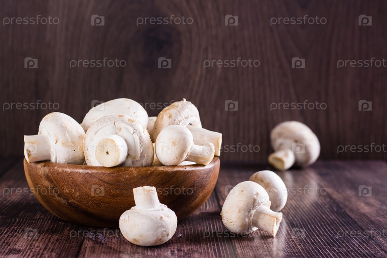 Сырые целые шампиньоны в миске и на деревянном столе