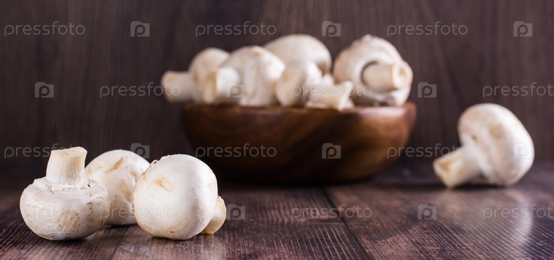Крупный план целых свежих шампиньонов на деревянном столе и в миске на фоне веб-баннера