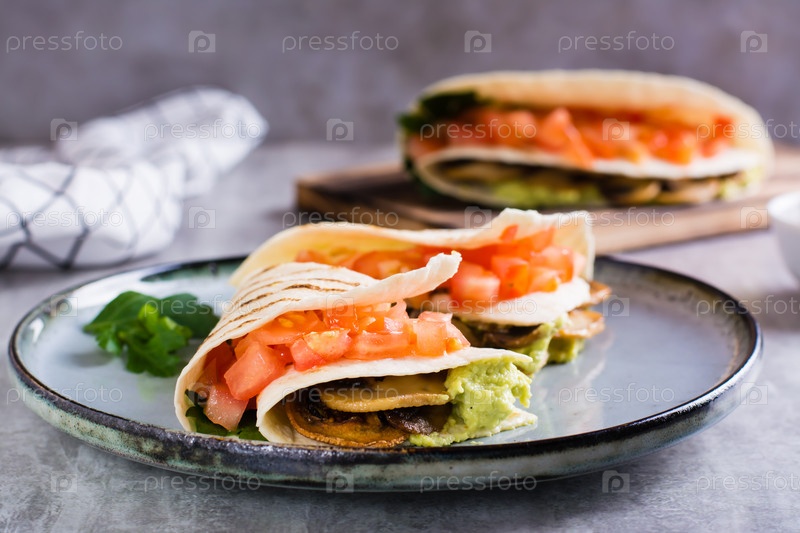 Тортилья с гуакамоле, жареными грибами, помидорами и зеленью на тарелке