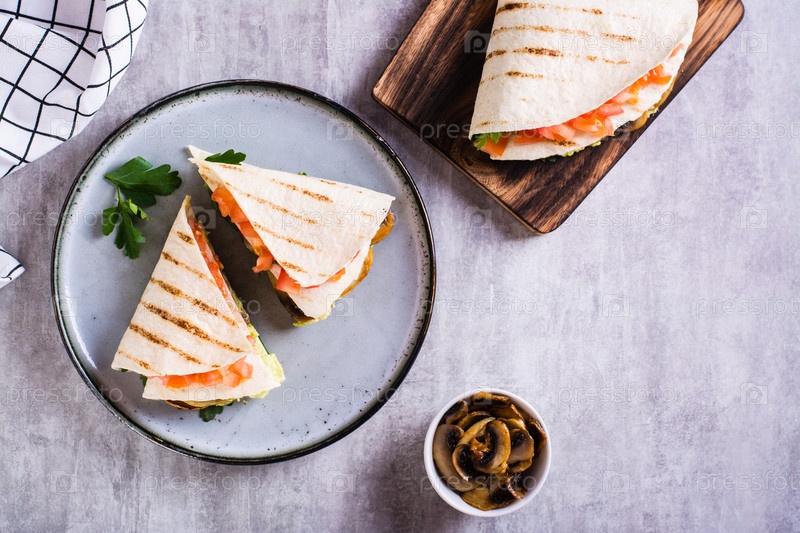 Тортилья с гуакамоле, жареными грибами, помидорами и зеленью на тарелке сверху