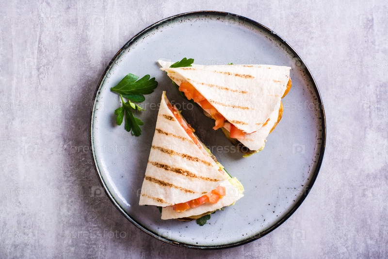 Крупный план тортильи с гуакамоле, жареными грибами, помидорами и зеленью на тарелке сверху