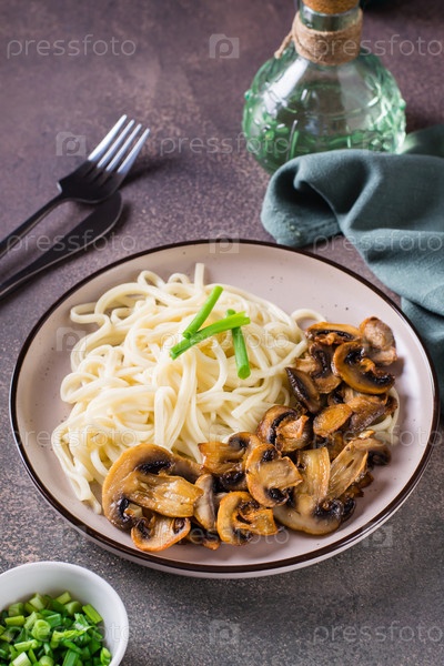 Лапша удон, жареные шампиньоны и зелень на тарелке на столе вертикальный вид