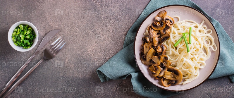 Лапша удон, жареные шампиньоны и зелень на тарелке на столе, вид на веб-баннер