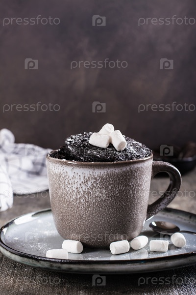 Шоколадный торт в кружке с зефиром и сахарной пудрой для домашнего десерта по вертикали