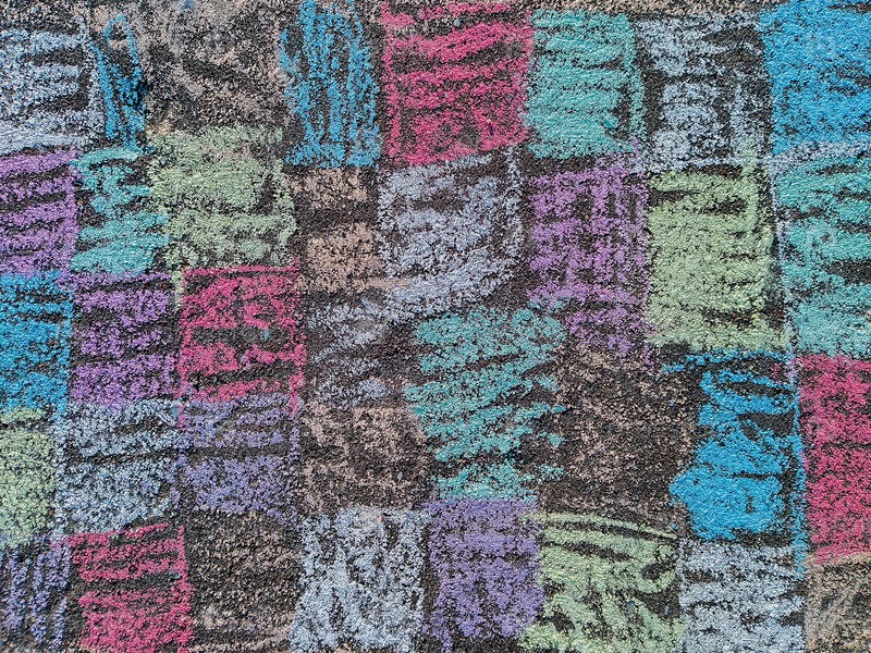 Детский рисунок мелом на асфальте разноцветных квадратов на старом гранжевом бетонном тротуаре в качестве текстурированного фона