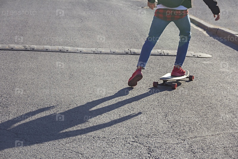 Вид на ноги молодого скейтбордиста, катающегося на скейтборде, приближающегося к лежачему полицейскому на городской уличной дороге
