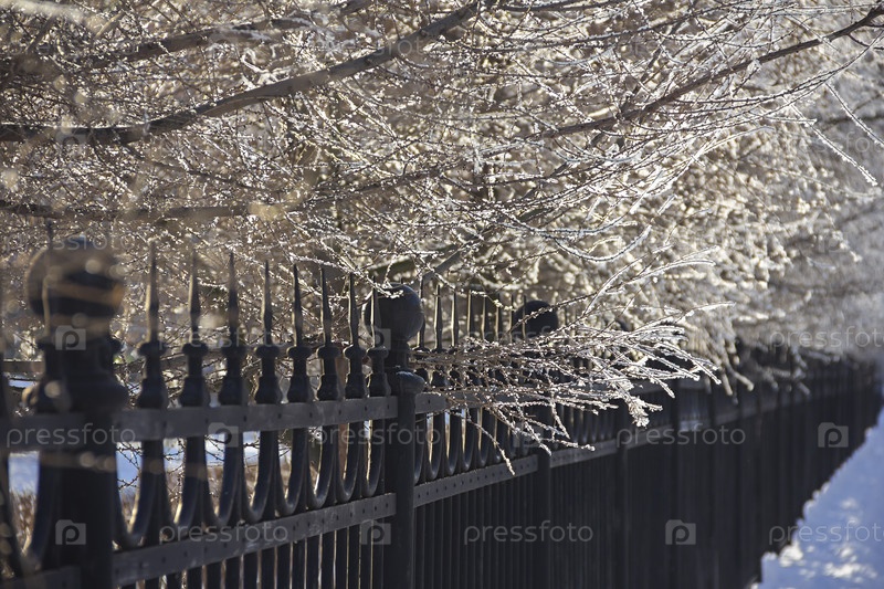 Белый иней на ветвях пихты в городском парке, висящий зимой над черным забором