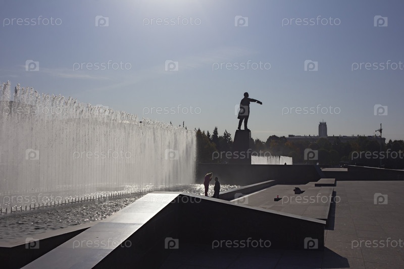 Санкт-Петербург, Россия, 02 октября 2020 г. Архитектурный ансамбль Московской площади: Дом Советов (сталинский ампир), городские фонтаны и статуя Ленина