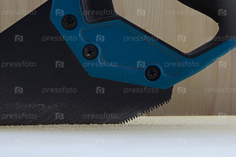 Мужчина режет доску ручной пилой, кругом опилки