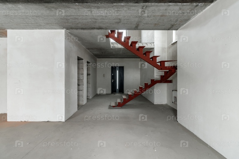 Ремонт в здании. Здание с металлической лестницей во время ремонта. Строительная площадка в доме без людей. Строительство нового дома. Строительство и архитектура