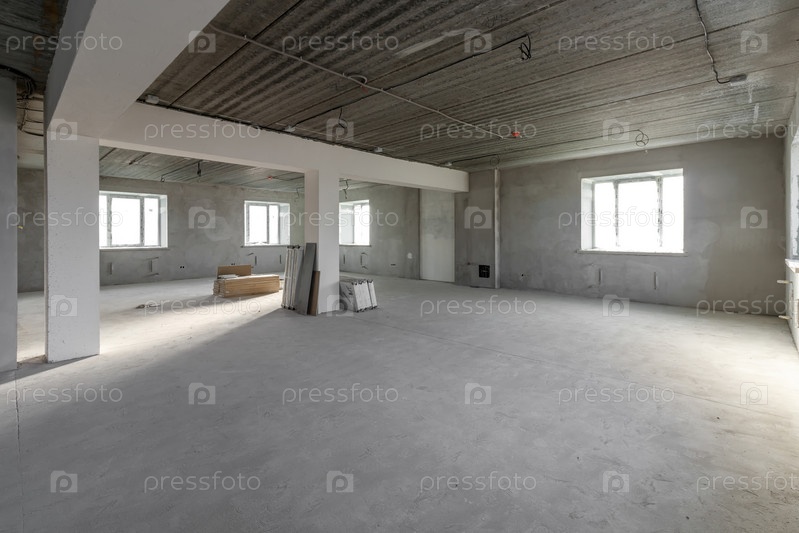 Просторные пустые комнаты мансардного этажа после выполнения работ на стене и потолке
