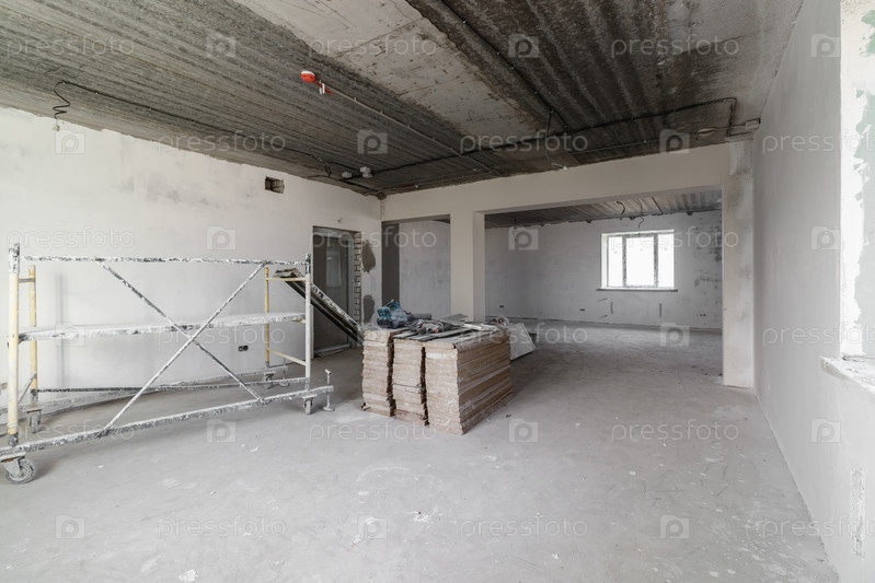 Просторные пустые комнаты на мансардном этаже после выполнения работ на стене и потолке
