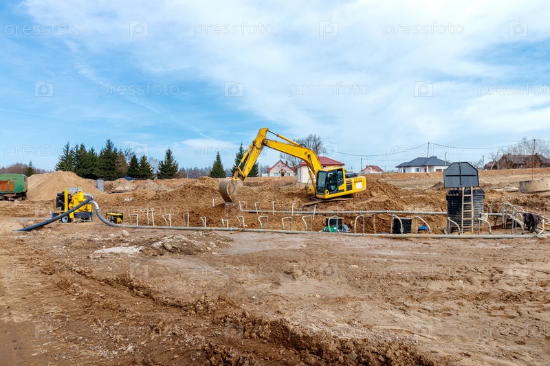 Экскаватор копает траншеи на строительной площадке. Траншея для укладки наружных канализационных труб. Канализационная система многоэтажного дома. Рытье котлованного фундамента