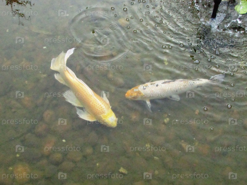 Два желтых карпа плавают в пруду
