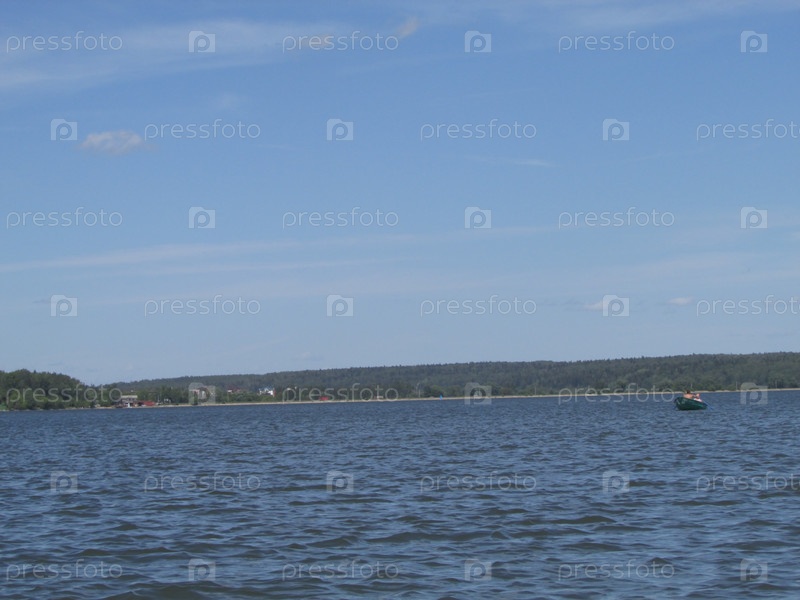 Одинокая лодка плывет по озеру на фоне голубого неба
