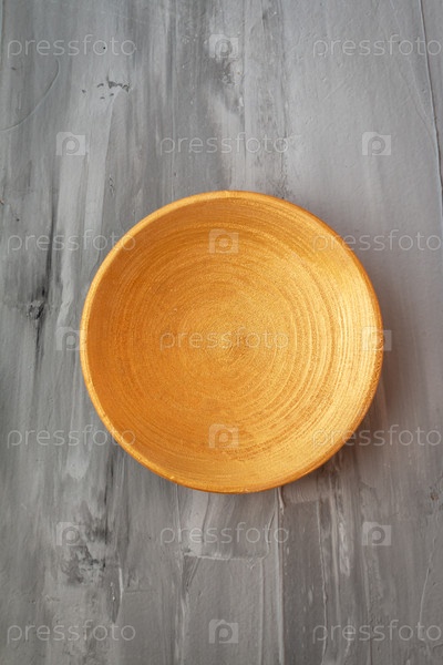 Золотая расписная деревянная тарелка ручной работы на сером фоне