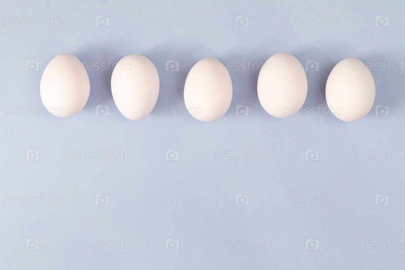 Группа белых куриных яиц на голубом фоне, пустое место для текста