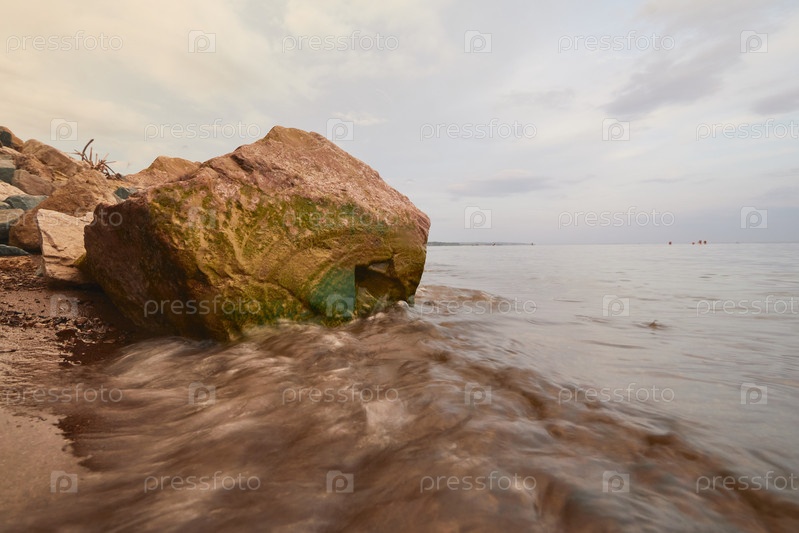 Скалы на речном пляже с размытием волны, выборочный фокус