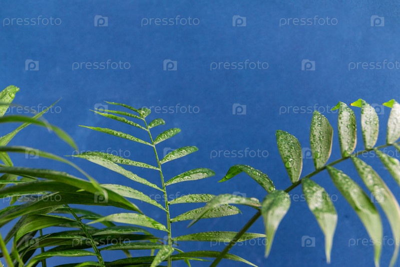 Ветки пальмы дома в горшке на синем фоне, место для текста