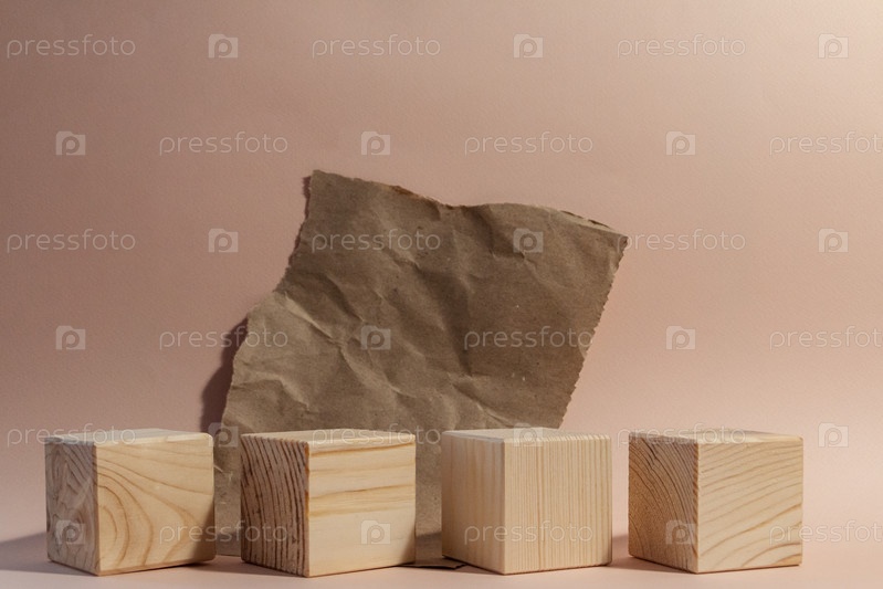 Деревянные кубики с рваной бумагой натюрморт на бледно-розовом фоне