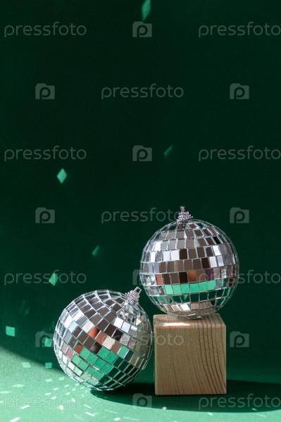 Натюрморт с деревянными кубиками и диско-шаром, отражающим солнечные блики на изумрудно-зеленом фоне