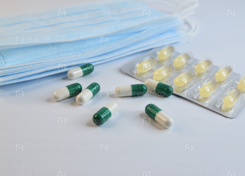 Рассыпанные по белому столу пилюли рядом с запечатанным блоком таблеток и стопкой санитарных масок