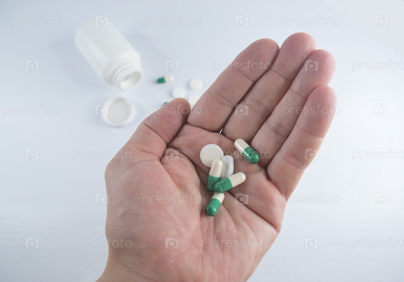 Разноцветные пилюли лежащие на раскрытой ладони руки