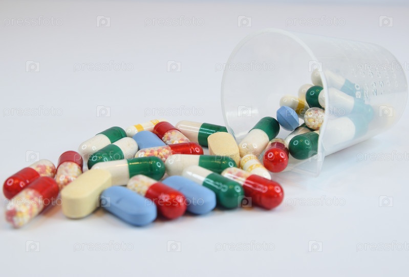 Опрокинутый пластиковый стаканчик с рассыпанными пилюлями