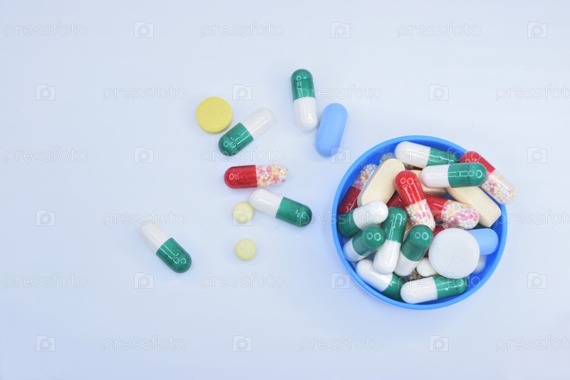 Пилюли рассыпанные по белому столу в больнице