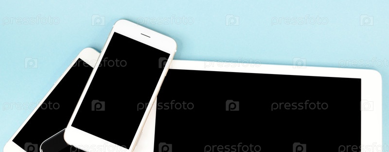 Крупный план планшетного компьютера, лежащего с несколькими смартфонами на голубом фоне