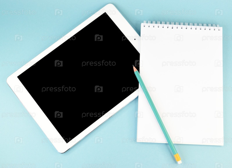 Блокнот с карандашом лежит поверх планшетного компьютера