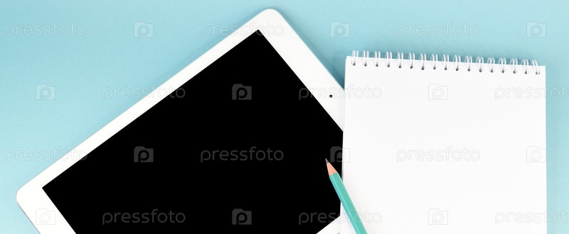 Крупный план блокнота с карандашом, лежащего на планшетном компьютер