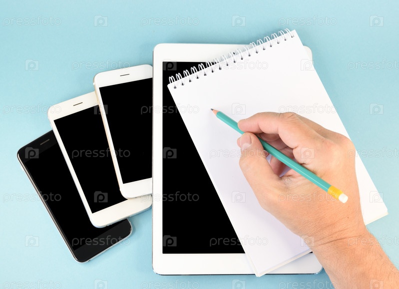 Мужская рука делает пометки карандашом в блокноте. Блокнот лежит на смартфонах и планшете