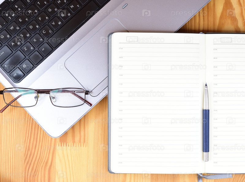 Ежедневник, открытый на чистой странице, лежит на ноутбуке. Очки и шариковая ручка лежат рядом