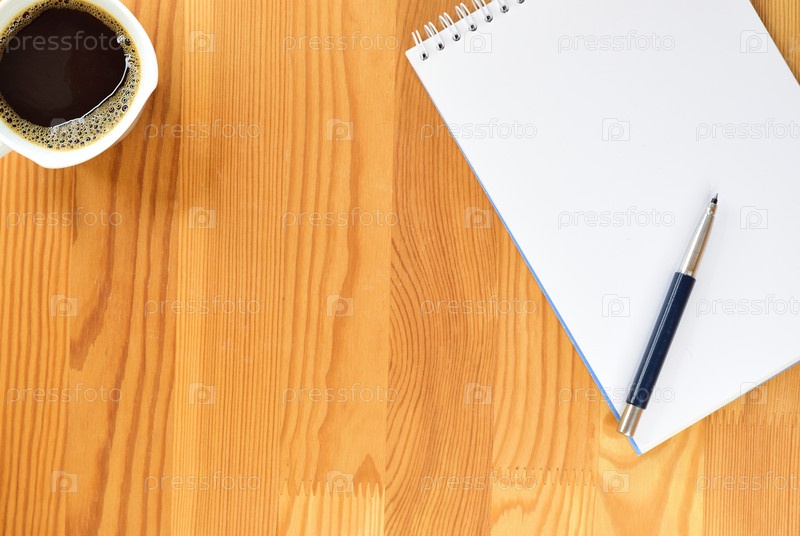 На деревянном столе лежит блокнот на пружинке. На блокноте лежит ручка. Рядом кружка кофе