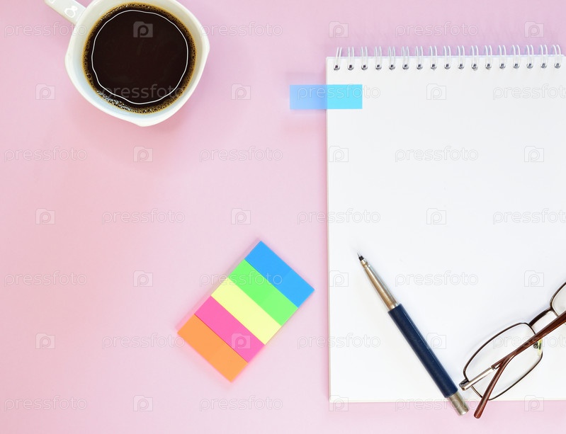 Блокнот на пружинке с очками и ручкой. Рядом стоит кружка черного кофе. Рядом с блокнотом лежит набор цветных стикеров для заметок
