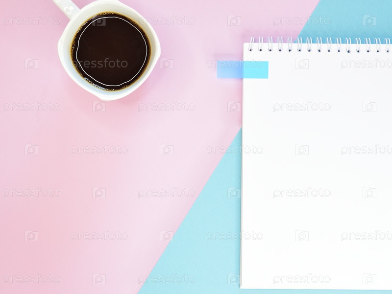 Блокнот на пружинке на розовом фоне. К блокноту прикреплена наклейка-закладка. Рядом стоит кружка черного кофе