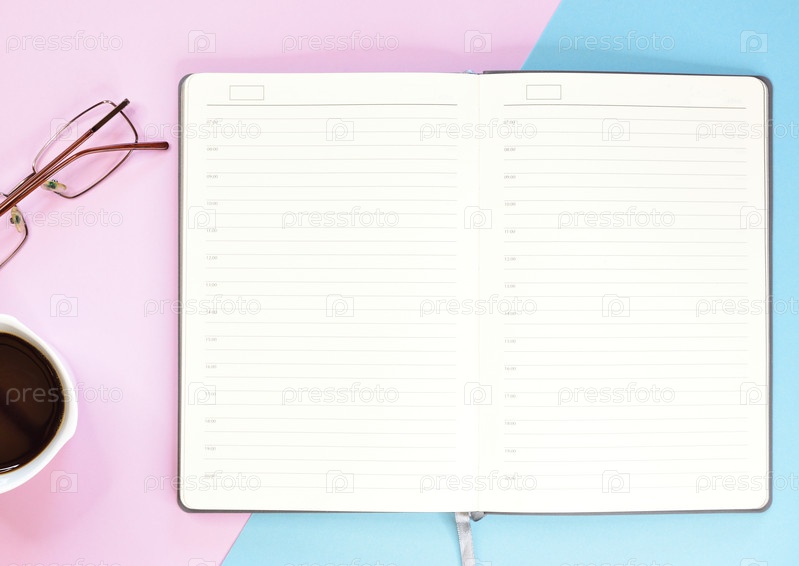 Ежедневник, открытый на чистой странице для планирования нового дня, лежит на розово-голубом фоне. Рядом видны очки и кружка черного кофе