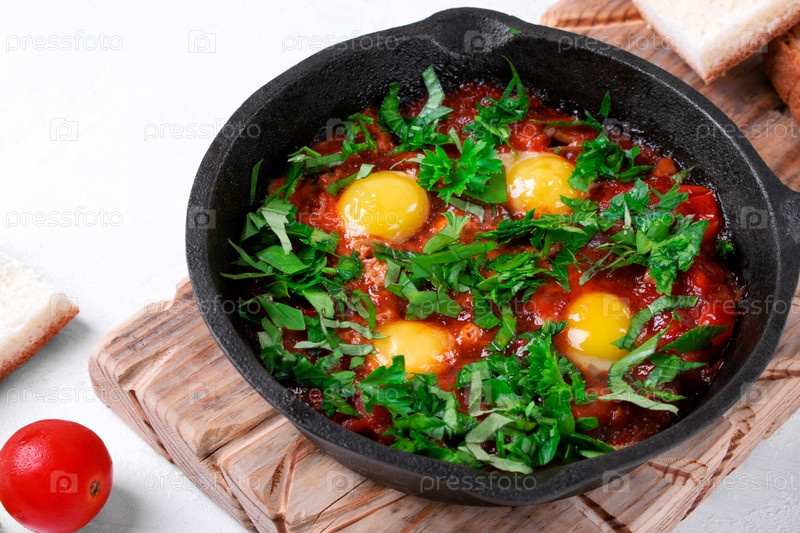 Шакшука с перепелиными яйцами и томатным соусом с зеленью подается на чугунной сковороде. Ближневосточная и африканская еда