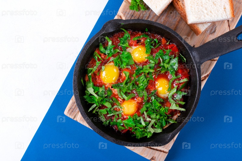 Шакшука с перепелиными яйцами и томатным соусом с зеленью подается на чугунной сковороде. Ближневосточная и африканская еда. Вид сверху