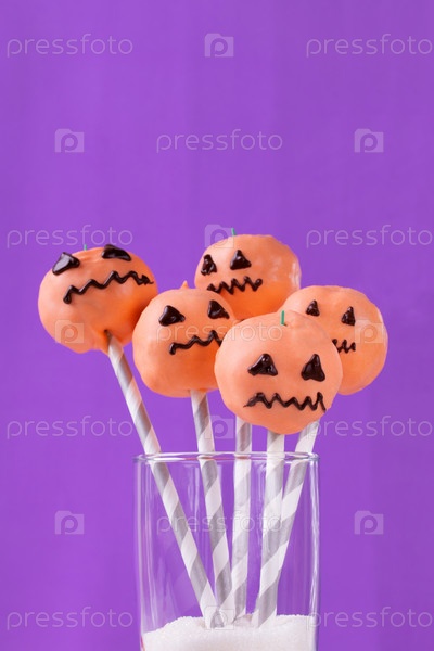 Хеллоуин тыквенный торт хлопает в стекле на фиолетовом фоне. Праздничные угощения