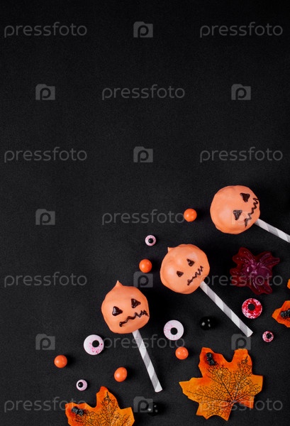 Хеллоуинские тыквенные хлопья и сахарная крошка на черном столе. Праздничные угощения. Копировать пространство