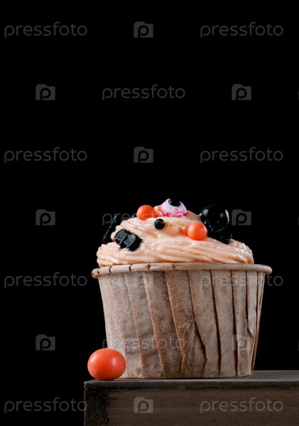 Кекс с апельсиновым кремом и праздничной сахарной посыпкой на черном фоне. Десерт на Хэллоуин