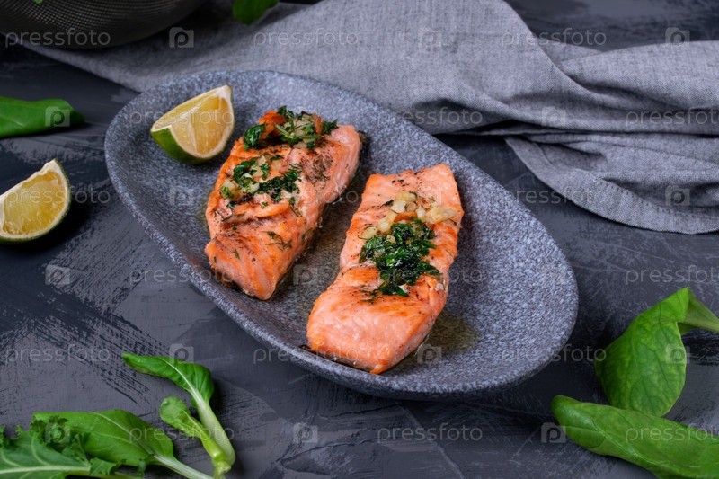 Жареные стейки форели с маслом, травами и чесноком на серой тарелке. Горячая кето еда