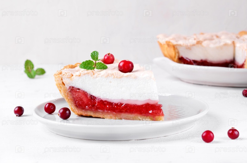 Кусок пирога безе с ягодным джемом на песочном тесте подается на белой тарелке. Изысканный десерт