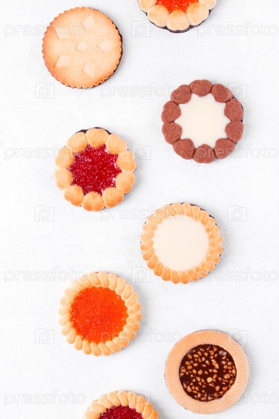 Ассортимент печенья с начинками на белом столе. Плоская укладка. Продовольственный фон