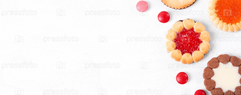 Веб-баннер с печеньем с начинками и конфетами на белом. Шаблон с копией пространства. Продовольственный фон