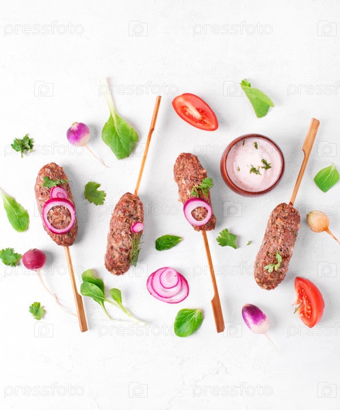 Люля кебаб из баранины на шпажках. Редис, китайская капуста, помидоры, красный лук и йогуртовый соус вокруг. Блюдо кавказской кухни. Вид сверху
